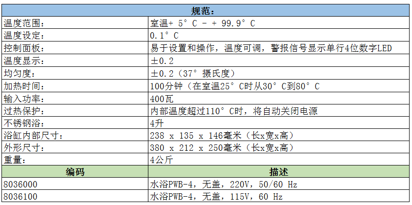 水浴鍋PWB-4個(gè)性化前沿PID微處理器控制的水浴鍋PWB-4和PWB-8的規(guī)格,易于操作和占地面積小,設(shè)計(jì)用于化學(xué),制藥,醫(yī)學(xué)和生物常規(guī)實(shí)驗(yàn)室以及研究目的。水浴鍋PWB-4控制面板易于設(shè)置和操作,溫度可調(diào),警報(bào)信號(hào)顯示單行4位數(shù)字LED。水浴鍋PWB-4當(dāng)內(nèi)部溫度超過110°C時(shí)將自動(dòng)關(guān)閉電源。